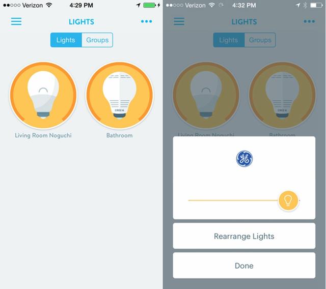 在应用程序控制上面,Link和其他联网灯泡并无不同。首先,你需要确保电源开关处于开启状态,这样才能使用应用控制灯泡的开启和关闭。相比市面上的其他家庭自动化中枢,Wink Hub的界面更加直观,卡通化的设计也很吸引人。当点击灯泡图标时,应用所弹出的控制菜单可让你单独控制每一只灯泡,或是对它们进行批量控制。