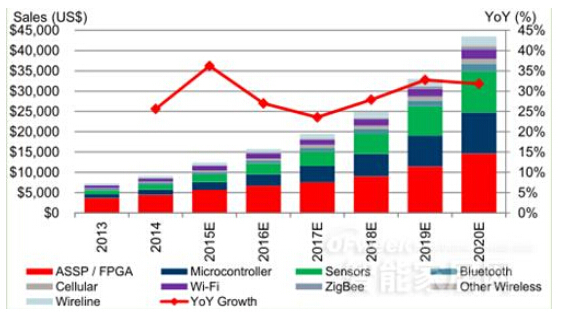 研究机构Gartner认为,随着IoT产业的发展,半导体产业特别是无线连接产业将迎来连续多年的高速成长期,年均增速维持在25%以上。