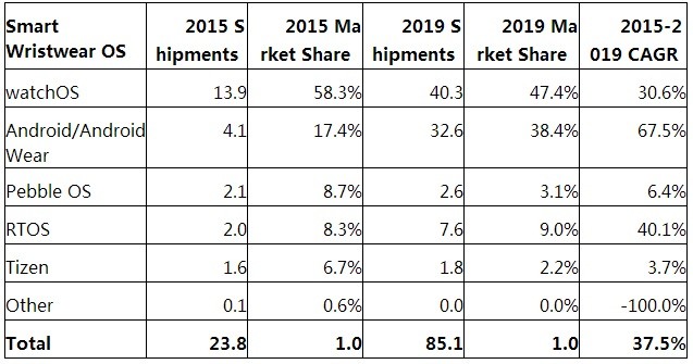 Android/Android Wear设备今年的出货量将达到410万部,市场份额为17.4%。而2019年出货量将达到3260万部,市场份额为38.4%。