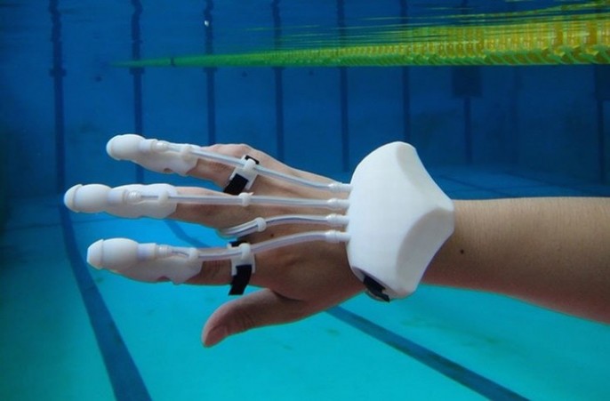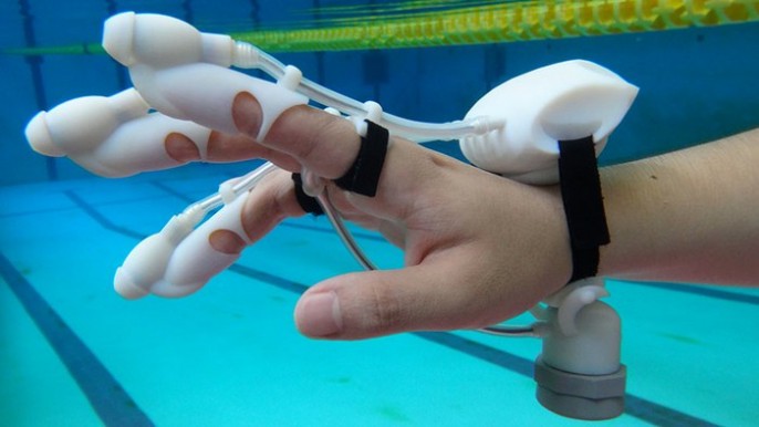 这会引导水流冲进三根手指上的硅胶帽,有选择地给对应的一根或多根手指施压。水下物体离一根手指越近,那根手指感受到的压力就会越大。这可以让用户感受水底的轮廓,或者其他水下物体的轮廓。