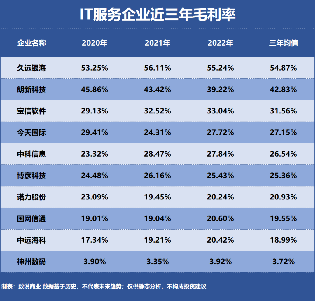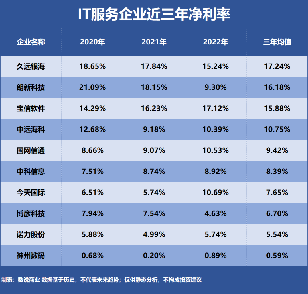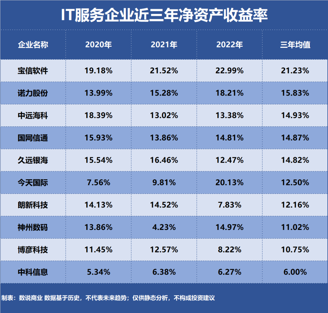 IT服务盈利能力前十企业,近三年净资产收益率、毛利率、净利率: