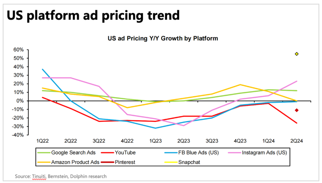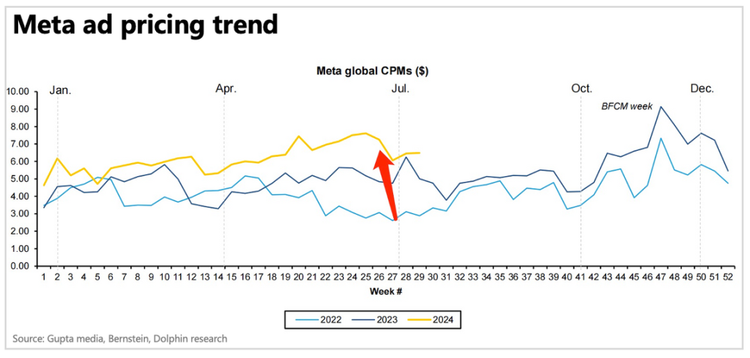 二季度Meta综合报价CPM增速达到了10%(vs 4Q23 6%),较上季度进一步加速。第三方平台显示,IG的CPM报价增速存在加速反弹。但进入三季度之后,整体CPM早期有明显的转弱迹象。
