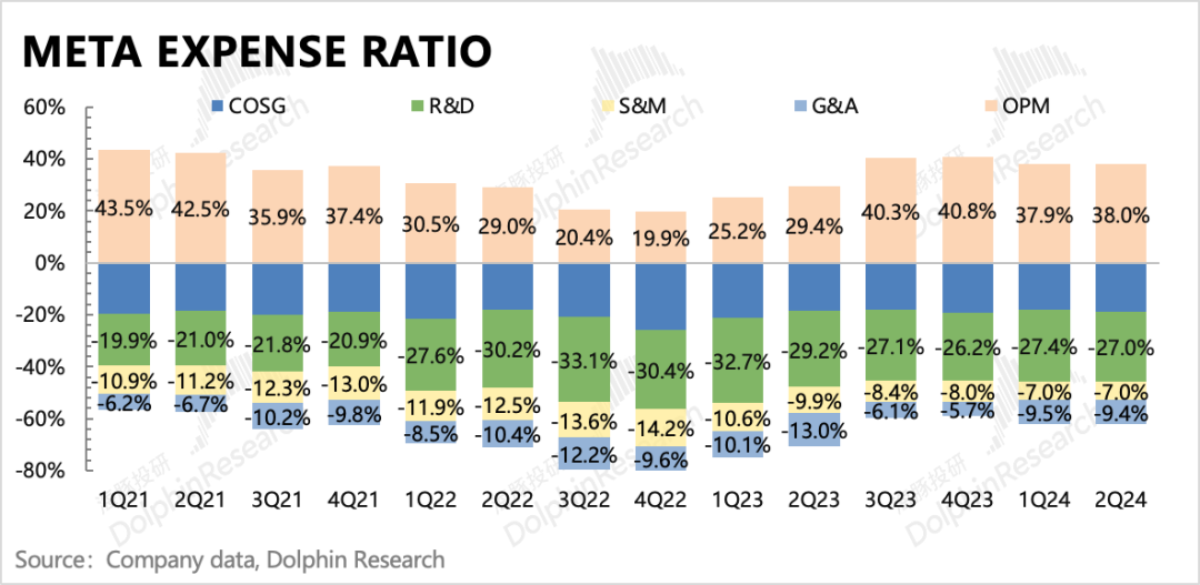 二季度Meta集团实现经营利润148.5亿,利润率38%,同比增长58%。如此高的增速主要源于经营费用的优化,Q2的销售费用、管理费用都在大幅下滑中,使得Meta的经营利润率从2Q23的29%提升到今年Q2的38%。