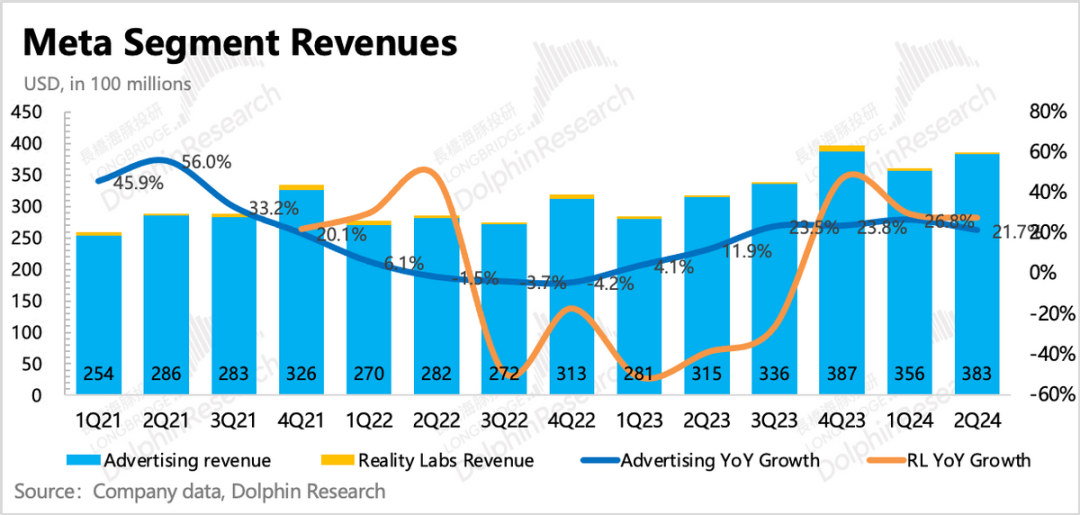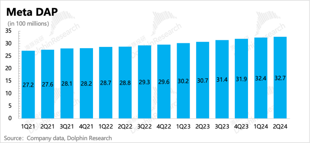 二季度Meta广告收入增速有21.7%,因为基数太高,相比一季度的26.8%的放缓节奏属于正常趋势,而市场预期只有19.3%。