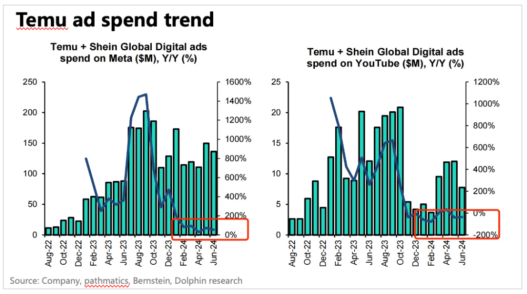 从第三方平台的调研和测算数据来看,Temu在Meta旗下平台上的投放是明确还在增长的(增速放缓无法避免),但在YouTube上的投放规模直接同比下滑了。