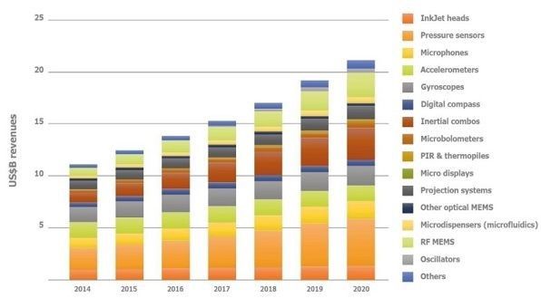根据Yole的数据显示,2014年全球MEMS营收达111亿美元。