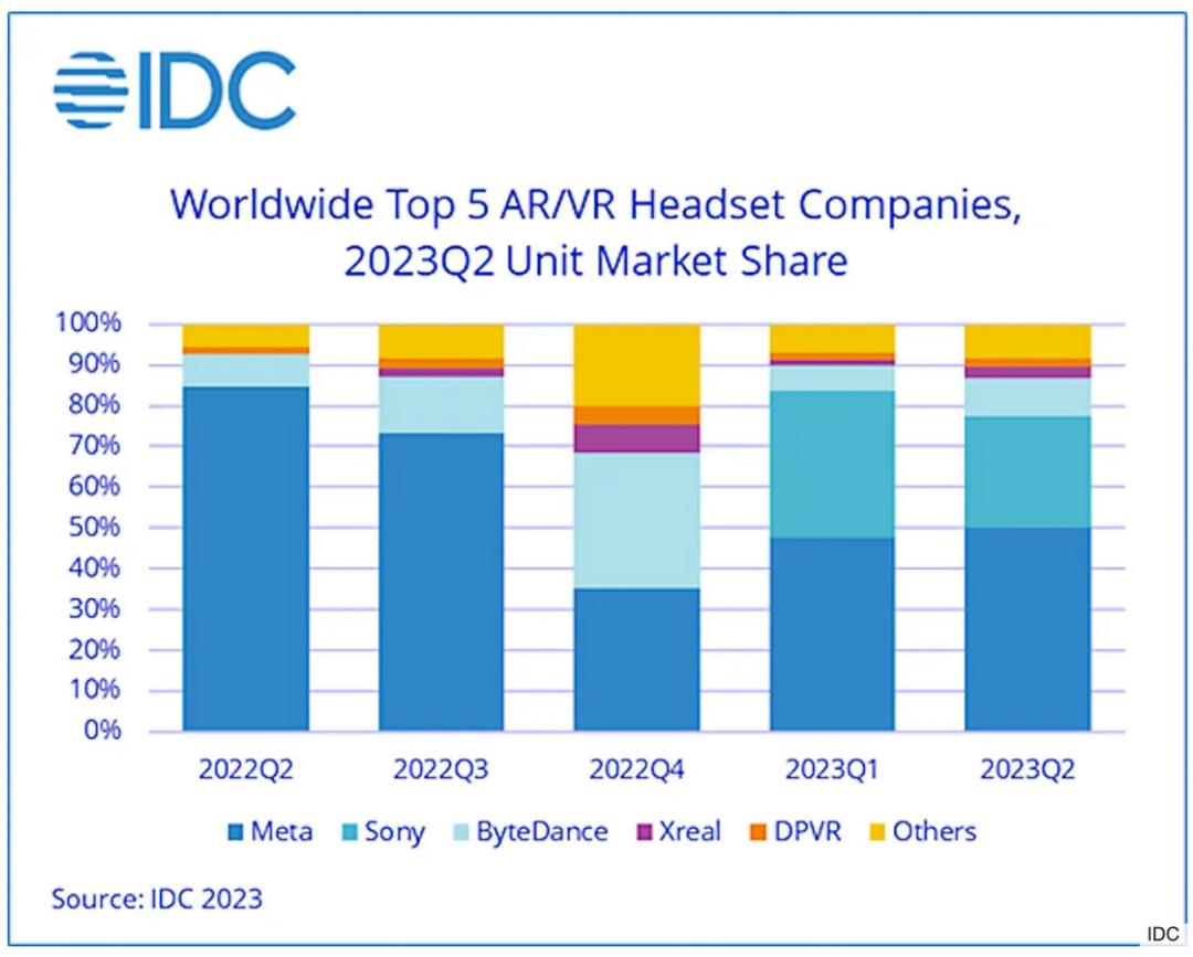作为VR头显的龙头,Meta的惨淡基本上等同于行业情况。1)根据IDC数据,全行业二季度同比下滑46%,但因为基数变低了,因此和Q1的下滑52%没啥实质性改善。截至2023年二季度,Meta的份额仍然接近一半。