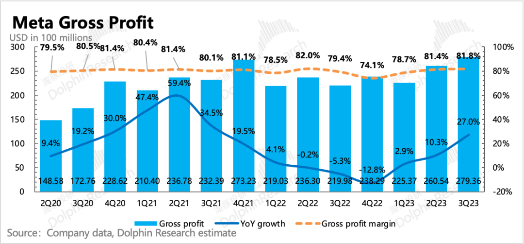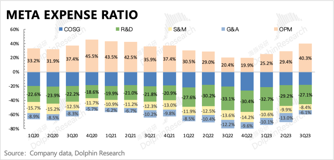 三季度Meta继续通过优化数据中心成本,以及高毛利率的广告收入贡献提升,推动整体毛利率改善至81.8%,但我们上季度也说,目前的水平已经达到近三年的历史巅峰期,所以后续优化的空间可能不多了。
