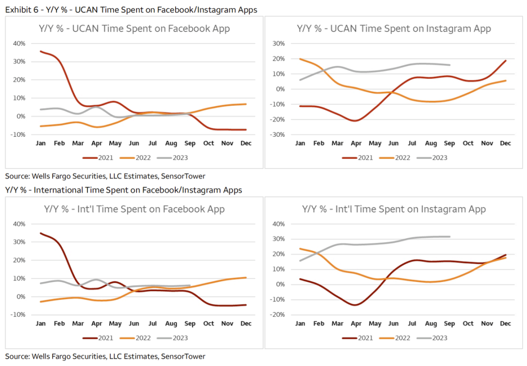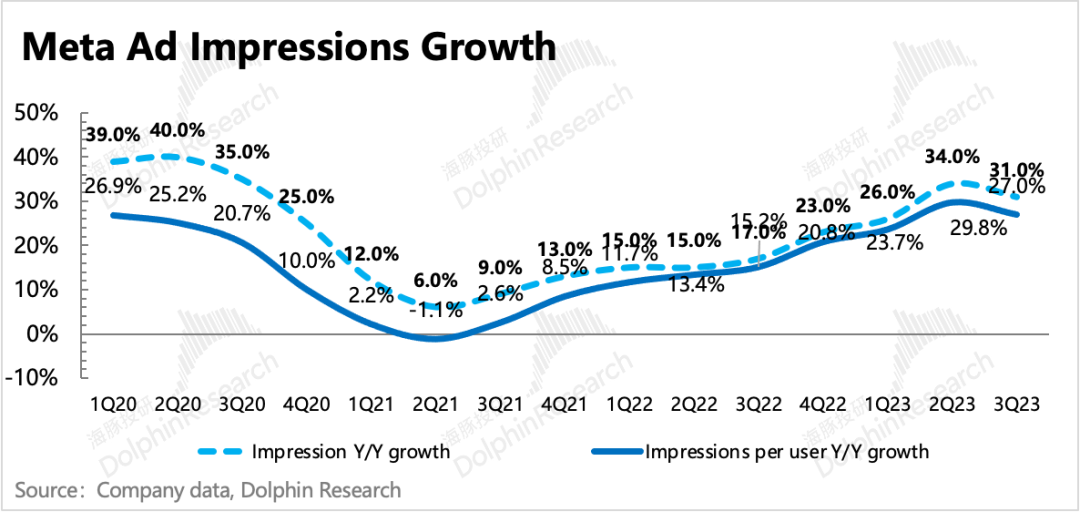 还是从广告的量价变动关系来看驱动因素:(1)广告展示量继续高速增长31%,除了用户规模扩大、用户粘性提高(全生态月活增长6.7%、日活增长7.2%),平均单个用户展示量也显著提升27%。排除法来看,在Meta目前几个平台广告变现都比较成熟的情况下(Threads后续表现不佳,发展潜力削弱),只能是通过填充Reels广告库存带来。