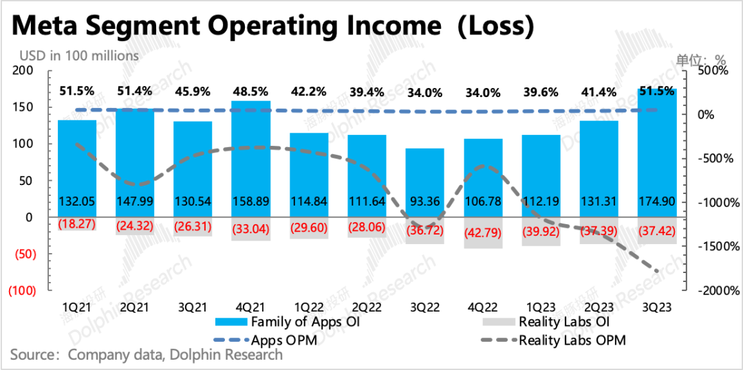 按照广告、元宇宙两大业务细分来看,元宇宙的亏损还在高额亏损中,管理层预计今明年Reality Labs的经营亏损还会继续增加。不过海豚君结合Meta对2024年的资本开支(300~350亿)和总支出(940亿~990亿)指引,以及主要投入方向(AI)来看,预计Reality Labs的亏损也不会增长的太夸张,整体算可控。目前广告业务比较强势,因此市场可能会对VR业务的可控范围内的亏损睁一只眼闭一睁眼。