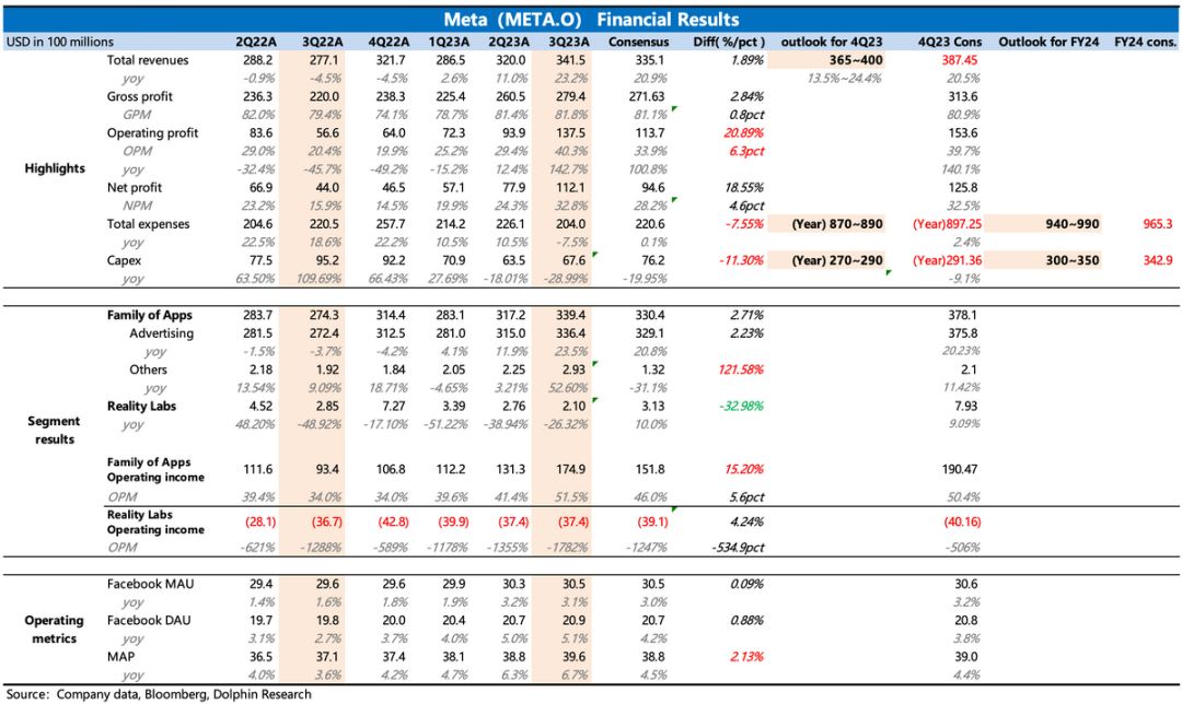 大家好,我是海豚君!Meta今晨(北京时间10月26日)发布了2023年第三季度财报。