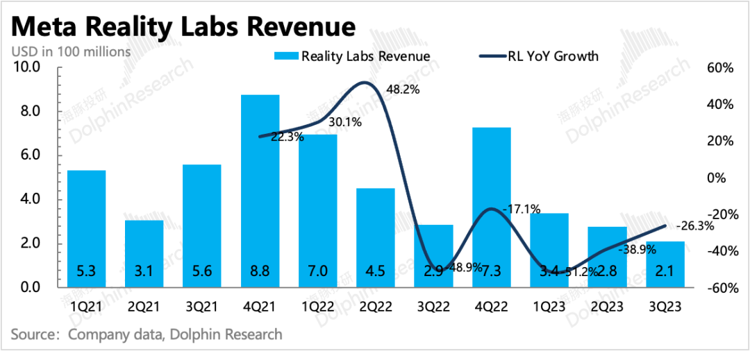 Reality Labs的收入已经崩了两个季度了,这个季度因为还没包含新品发售,因此仍然只有2.1亿的收入,继续同比下滑26%,整体仍然属于低谷期。海豚君简单测算预估二季度销量估计只有5、60万台,去年同期则有100万出头万(仅供参考)。