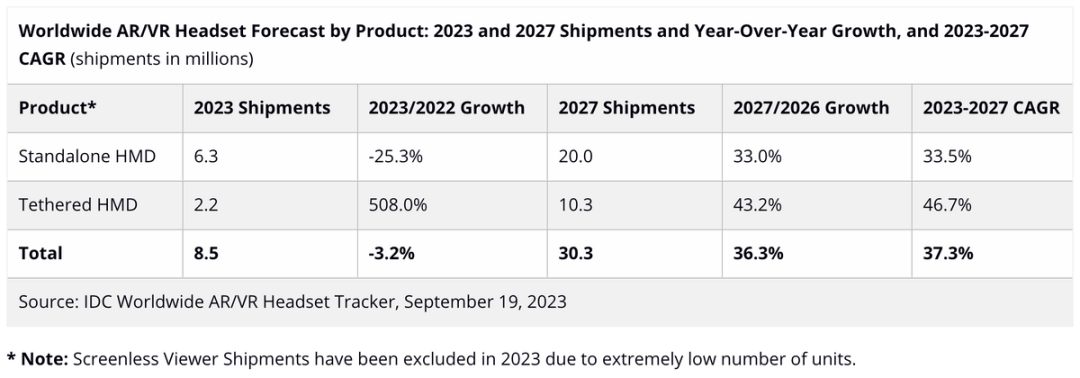 2)上个月,IDC又下调了2023年全年的VR/AR头显出货预期,从3月预期的959万台,下降至850万台,等于说去年以及今年初预期的2023年VR消费复苏没有来,反而进一步疲软了3.2%。