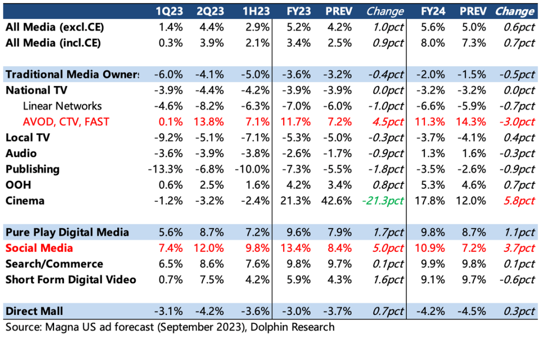 上个月,全球媒介智库公司 Magna再次上调了对美国数字广告2024年的增速,这对Google、Meta、Amazon三家广告巨头都有一定的信心提振。不过相比较而言,Magna对社交媒体广告明显给了更乐观的增长预期,搜索广告保持稳健,短视频广告虽然明年会整体加速,但和之前的预测相比,并没有太大的调整。