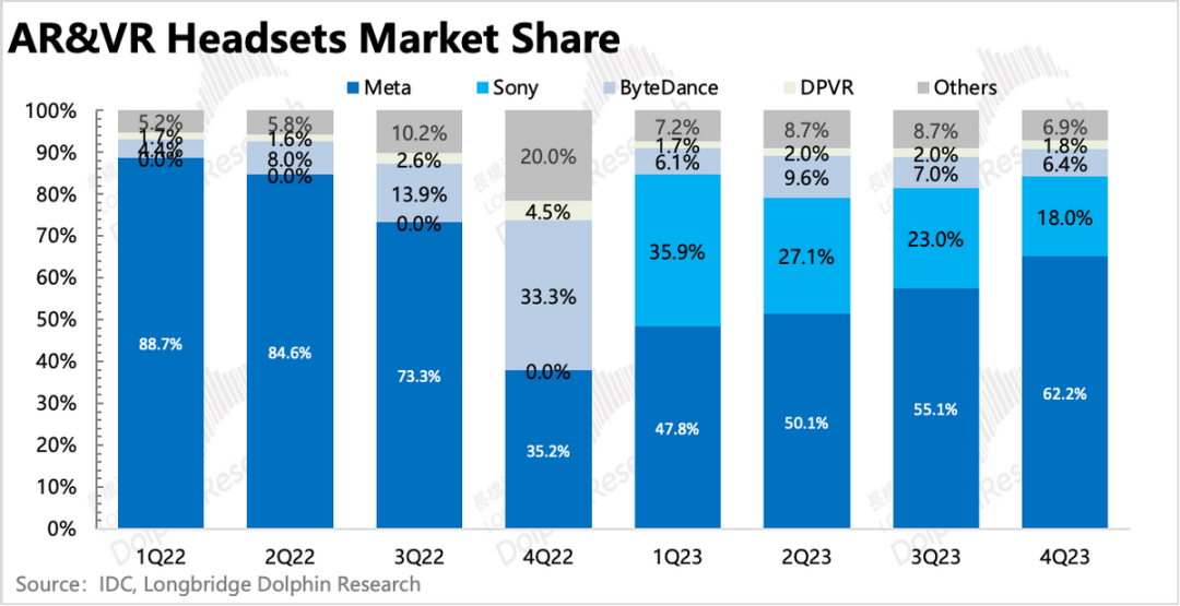 上季度Meta在Quest 3 热销的带动下,市场份额也回升至62.2%。IDC预估今年VR/AR头显出货量达到970万台,同比增长17%,也是预期一个在苹果Visionpro带动下的触底反弹,总出货量还是低于2021年。