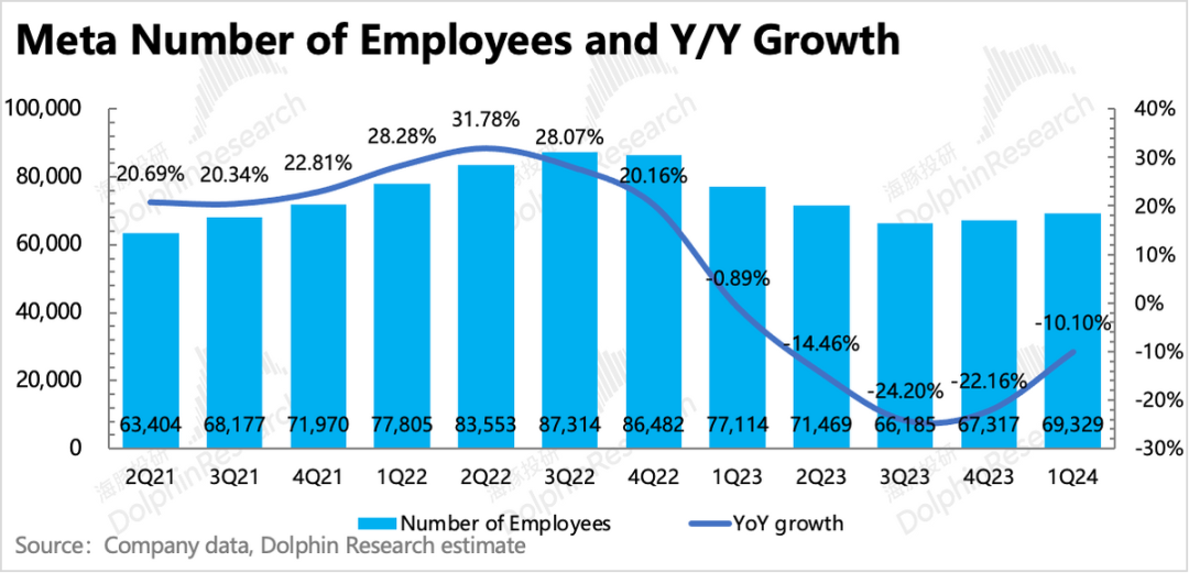 Meta降本增效了一年,至2023年底,也告一阶段了。2023年全年Meta累计减员近2万人,但四季度已经回归单季净增1132人。而一季度员工规模69329人,环比净增加2012人,扩张提速,预示着这一轮裁员提效的红利宣告结束。