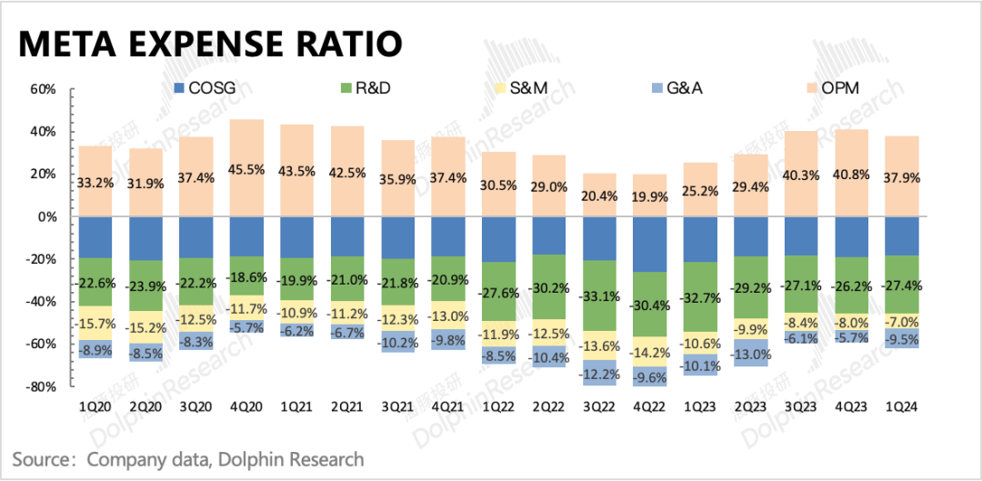 回过头来看毛利率,一如海豚君上季度预期,Meta的毛利率同比显著提升了3个点,达到82%,与困境之前相比已经基本恢复。短期加上AI投入一再上提,预计再提升会有点吃力。