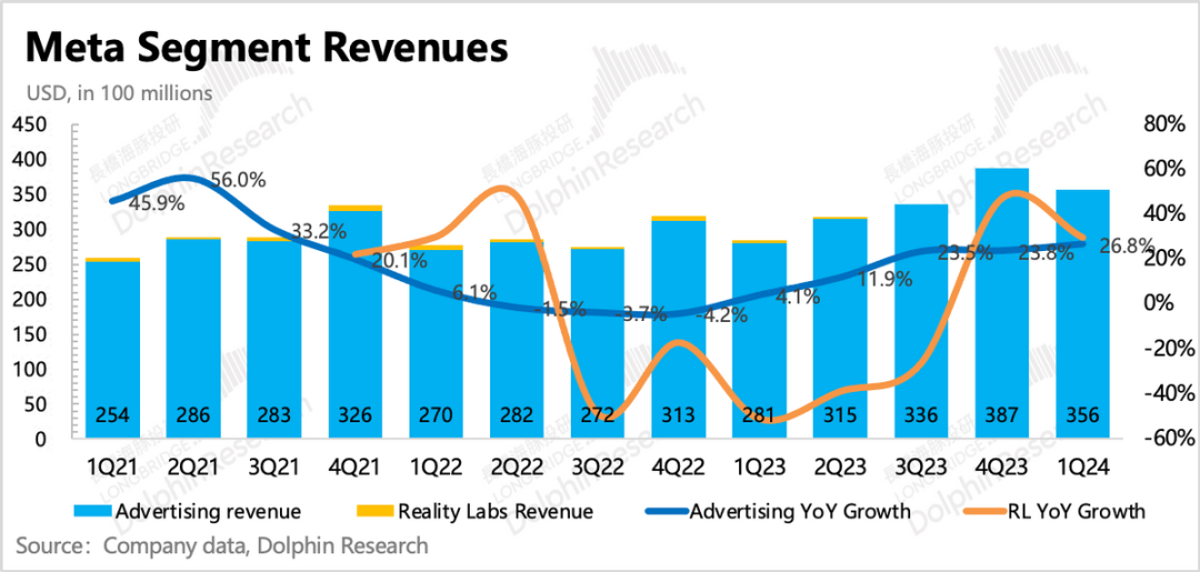 一季度Meta营收365亿,同比增长27%,虽然基数变高,但环比看仍然在加速。主要超预期的还是占比98%的广告业务,VR则因为Quest 3新品热度滑落,收入弱于预期。