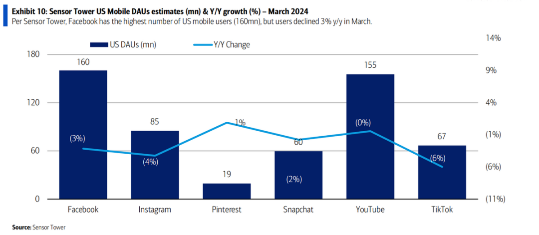 由于本季度未披露Facebook主站以及生态系月活的情况,只能结合第三方数据平台来看,无论是Facebook还是Instagram,北美地区用户增长有限,主要来源于国际地区。其中仍然是Instagram撑起了增长大旗,国际地区DAU同比增长4%,带动总时长增长8%,而Facebook的用户规模则都在同比下滑。