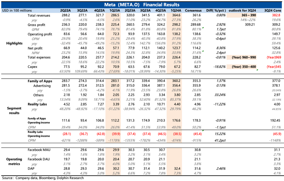 Meta管理层预计2Q24总营收365~390亿区间,对应变动为同比增长14%~22%,中位数略低于市场预期。虽然Meta指引风格保守低调的情况较多,但指引上沿也仅仅是贴合目前市场预期的水平,与上季度的表现大相径庭。