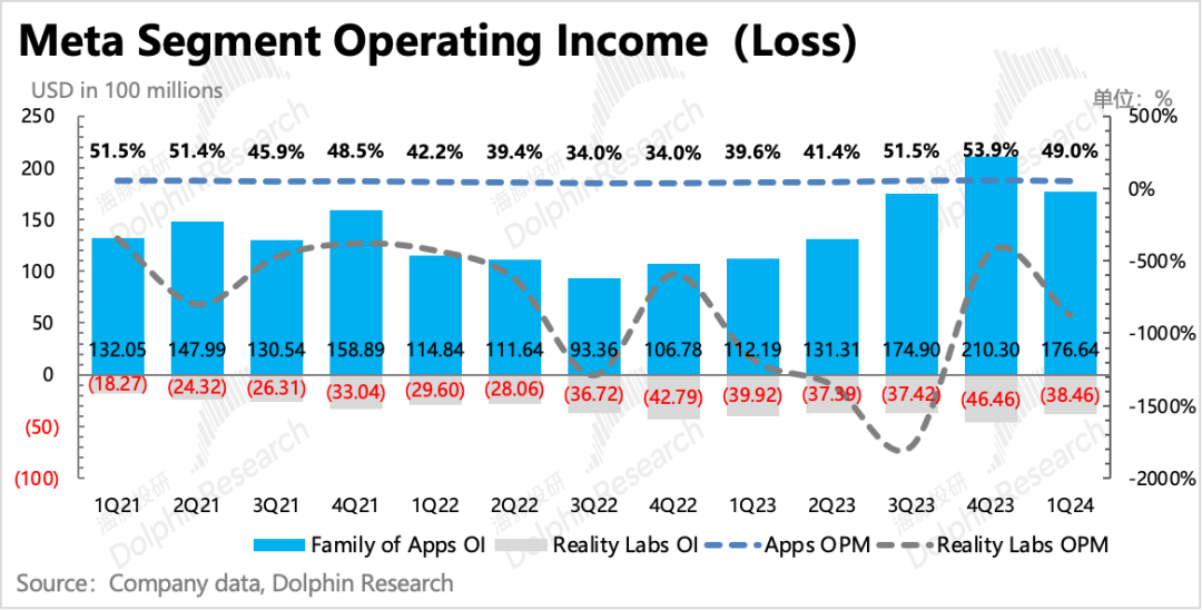 没了购物旺季的消费氛围,以及新品新鲜感,Quest 3的热度已经显著下降。一季度VR板块收入4.4亿,低于市场预期4.96亿。与此同时,经营亏损率再次扩大,不过市场预期较足,因此并不造成实质性的利空。