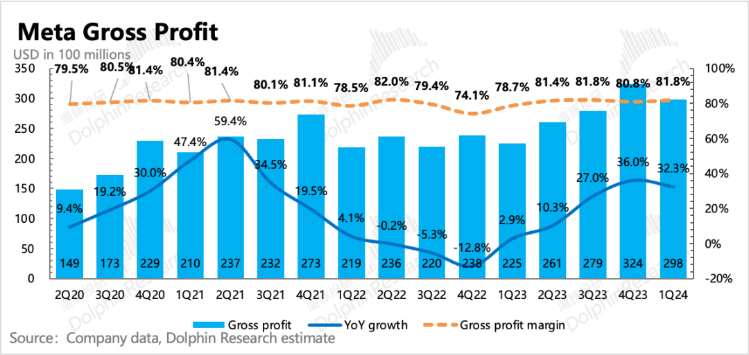 AI视频推荐提高用户粘性,进而驱动平台ROI提升的红利期下,Meta的毛利率环比进一步升至81.8%,这在往年Q1也是创新高的水平。
