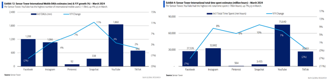 由于本季度未披露Facebook主站以及生态系月活的情况,只能结合第三方数据平台来看,无论是Facebook还是Instagram,北美地区用户增长有限,主要来源于国际地区。其中仍然是Instagram撑起了增长大旗,国际地区DAU同比增长4%,带动总时长增长8%,而Facebook的用户规模则都在同比下滑。