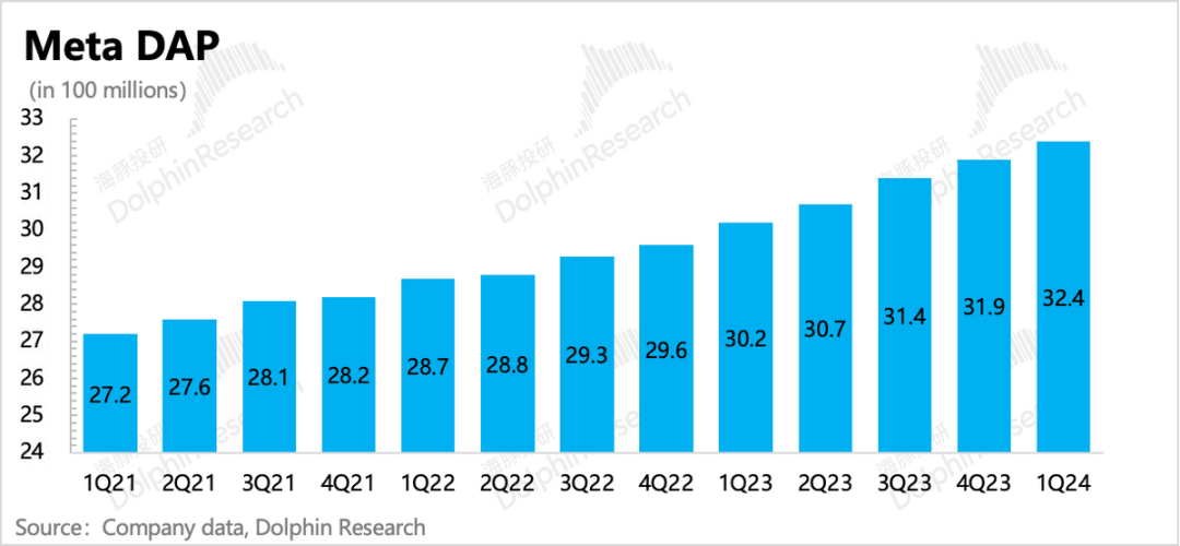 这次财报另一个变动是用户数只披露了平台生态的整体日活DAP 32.4亿,同比增长7%,超市场预期。分区域和Facebook主站本身的日活月活情况,本季度则没有披露。