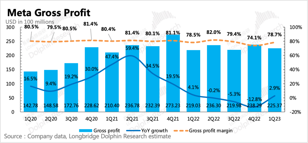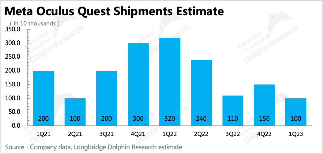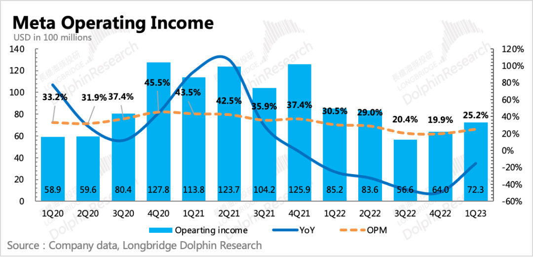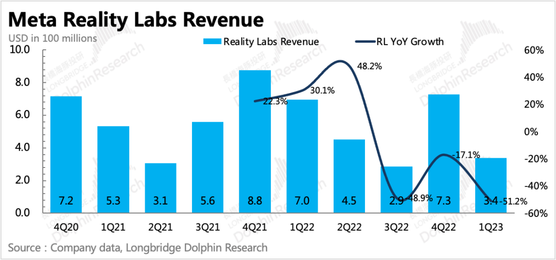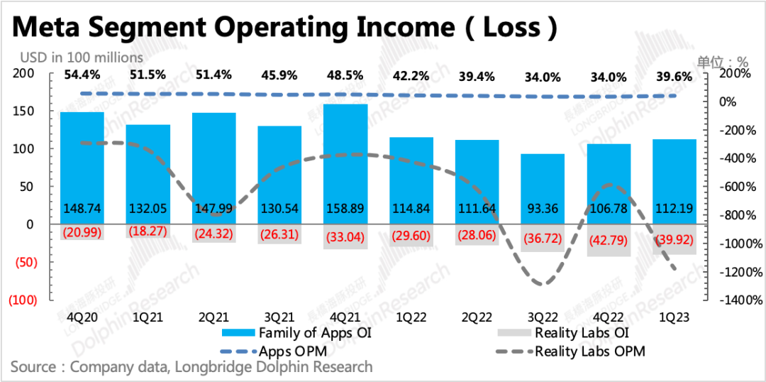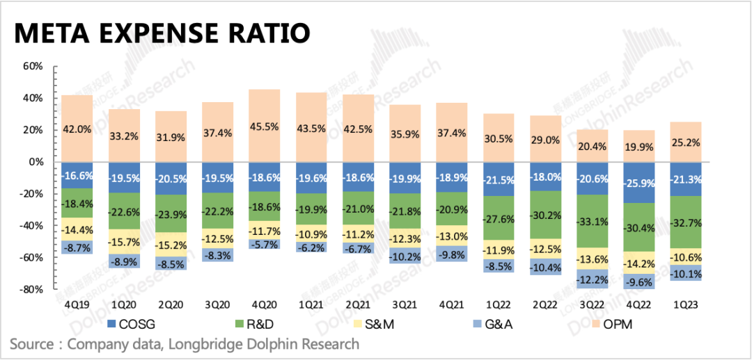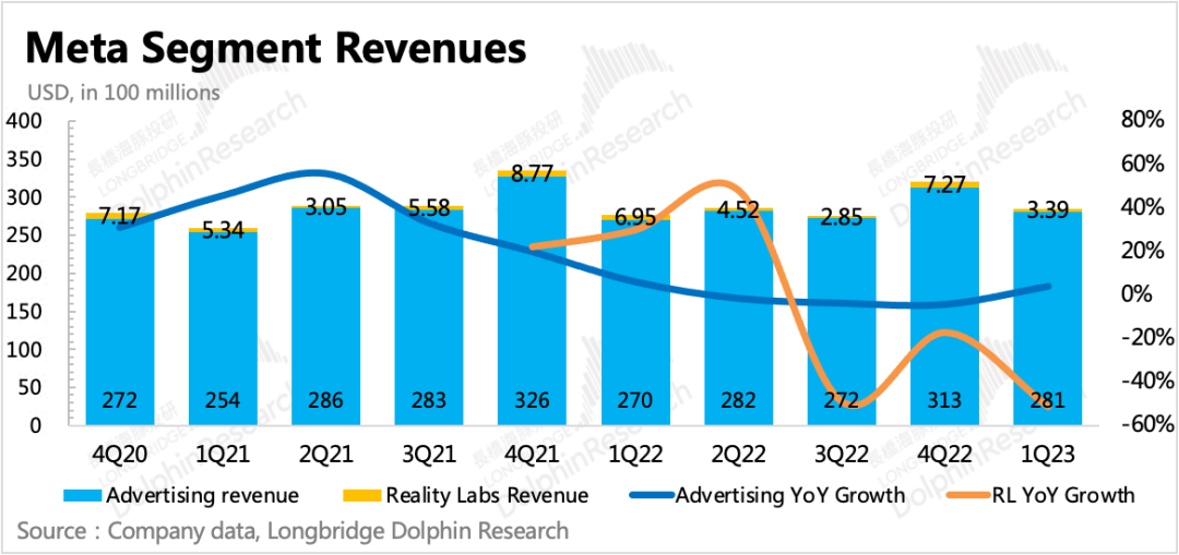按不同业务来看:(1)广告主打一个超预期修复,因为Meta的广告业务相对成熟,因此收入反弹不需要投入同步的成本费用,因此修复速度很快。(2)反之,VR部分,成本中除了基础设施折旧摊销,其他部分随着硬件销量变动。但研发费用也更偏固定,因此在收入滑坡下,亏损率会来得更夸张。