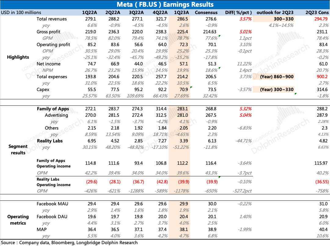 一季度Meta营收286.5亿,同比增长2.6%,而市场预期同比持平。主要超预期的地方是占比最大的广告业务,VR业务在这个季度同比下滑了51%,虽然有上年同期高基数的影响,但本身的用户需求转淡也是更深层次的拖累因素。对于2Q23的预期:公司定在了295~320亿区间,对应变动为增长2%到增长11%,其中高汇率的负面影响约1%,公司指引显著优于市场预期295亿。