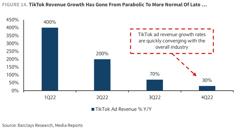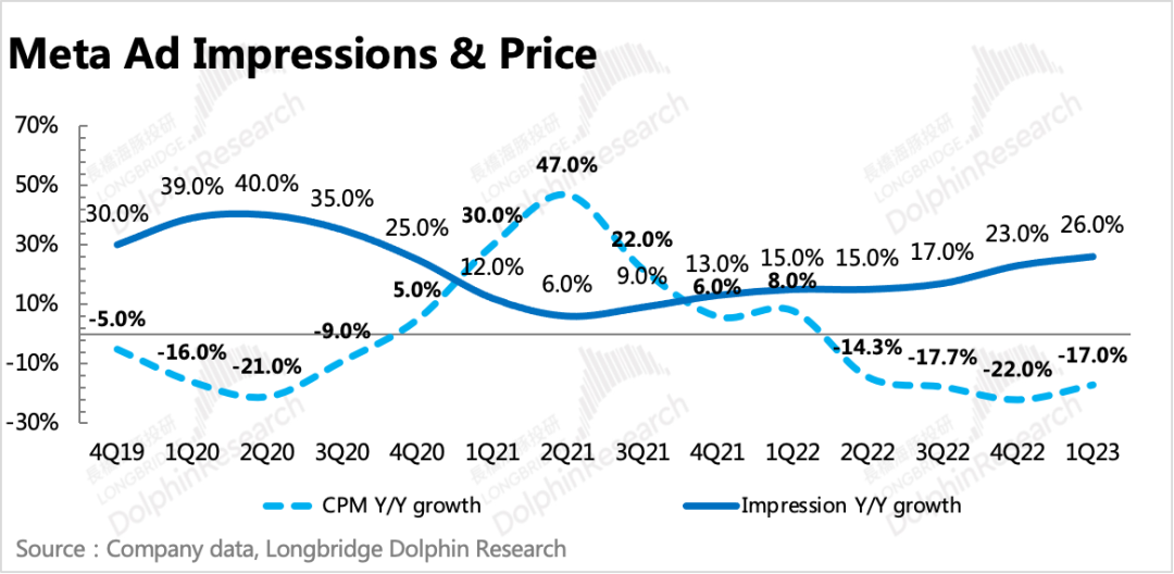 1、缓过IDFA和竞争,Meta的效果广告就回来了广告超预期到背后驱动力和海豚君在上季度财报点评中提及的一样:(1)一方面Reels进展不错,帮忙增加了不少广告库存,在经济走弱下,广告主更偏好效果广告,一季度广告展示量同比增长27%。(2)另一方面,TikTok遭遇禁用风险,广告主预算较紧的时候,很难再去考虑它,近期广告增速已经快速放缓,体现为Meta不断下滑的CPM有一定减速。
