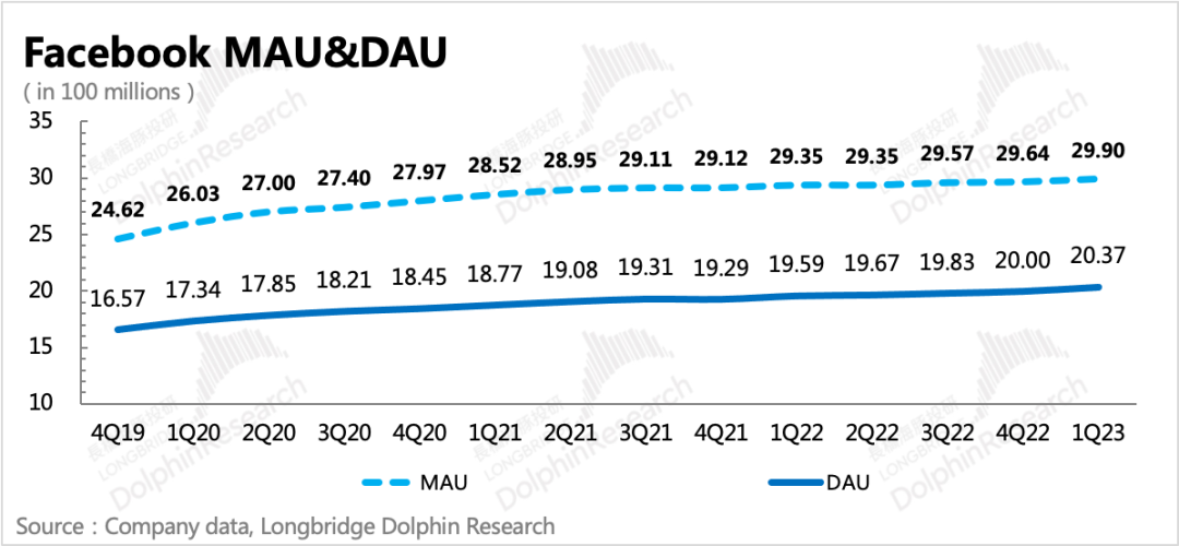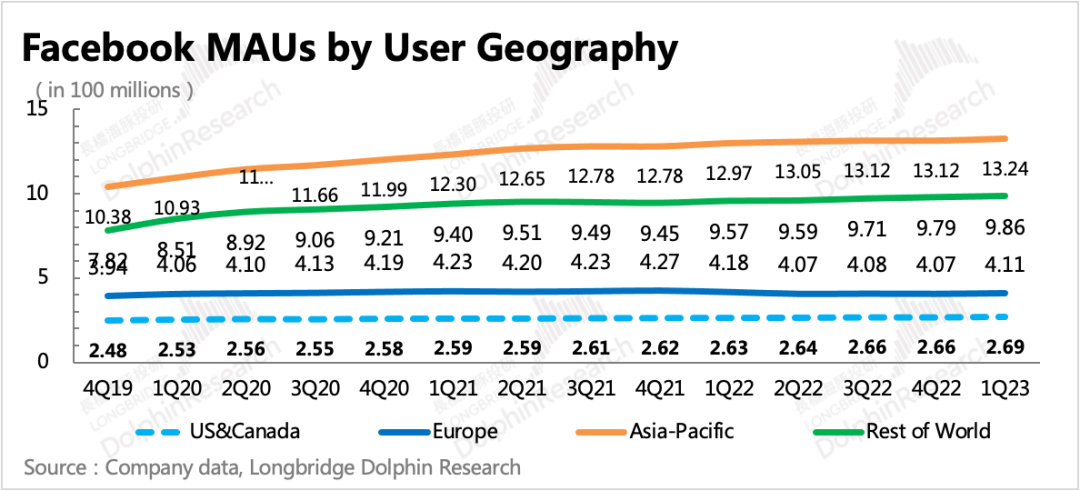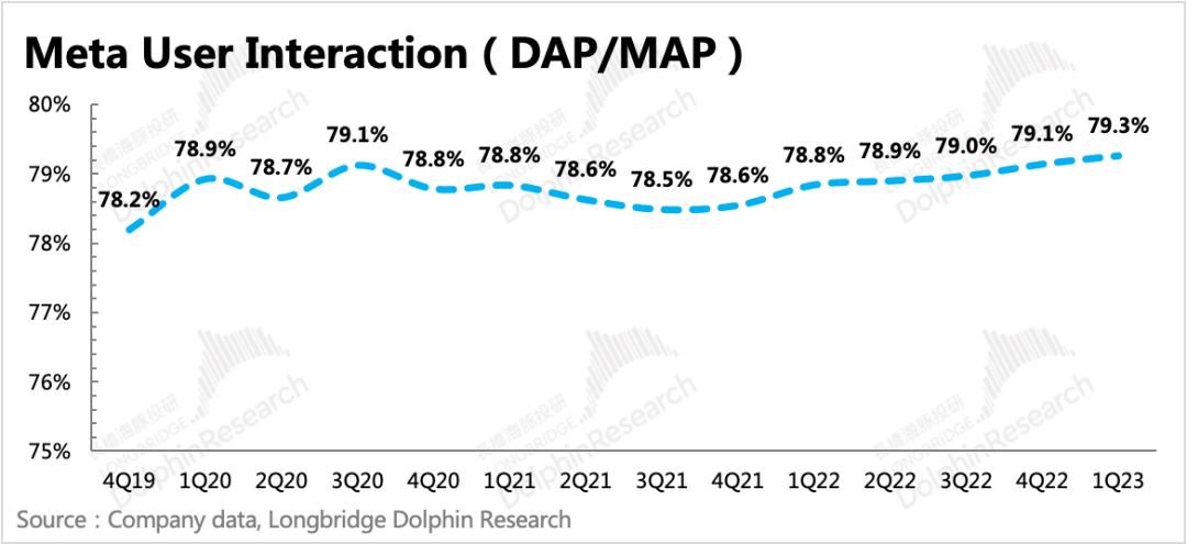 3、Reels继续推动流量增长。一季度Meta的生态用户达到38.1亿,日活达到30亿,用户粘性(DAU/MAU)继续环比提升至79.3%。主站Facebook在美地区的用户环比加速增长,但非主站增长更猛,应该主要来自于带有Reels的Instagram。