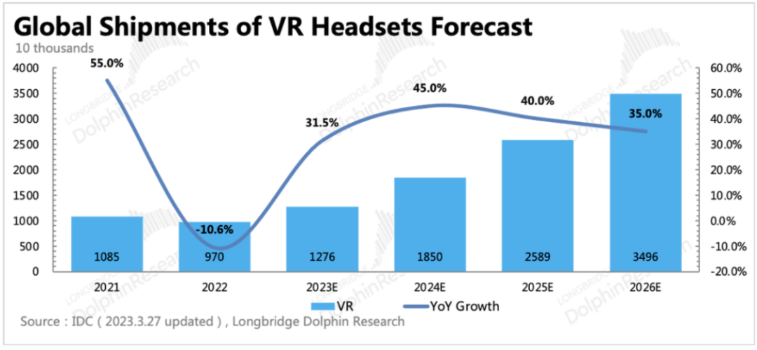 但一季度VR收入的惨淡还是超出了市场预期,收入腰斩的背后,除了公司短期的经营变化外,也有用户需求转淡的行业环境下行。IDC今年3月重新调整了对VR头显的预测,尤其是对近两年下调了不少。
