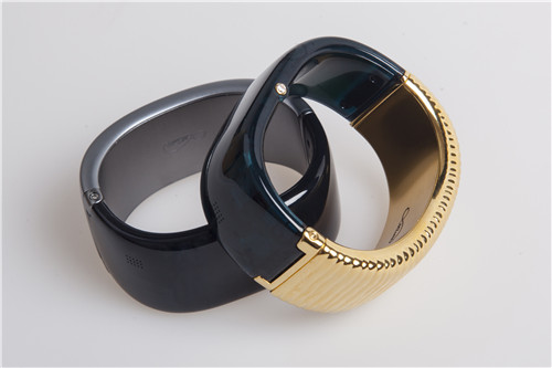 既然是情侣手环,Miss U采用了成双成对出售的模式,每对手环分为男女款式,女款充满了装饰感,采用镀金波纹外壳,并配有钻石按钮。而男款则采用了银色哑光喷漆处理,低调内敛。Miss U手环配有一块0.8寸的可触摸液晶显示屏幕,设计在了手腕内侧,防止隐私泄露。