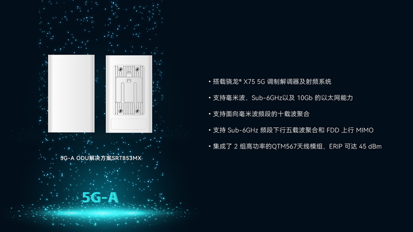 5G-A ODU解决方案SRT853MX搭载骁龙X75平台,支持毫米波、Sub-6GHz以及10Gb的以太网能力,覆盖全球运营商网络。SRT853MX支持面向毫米波频段的十载波聚合,以及Sub-6GHz频段下行五载波聚合和FDD上行MIMO,通过卓越的频谱聚合实现了更大的网络覆盖范围和网络容量。针对弱信号场景,该方案集成了2组高功率的QTM567天线模组,ERIP可达45dBm,支持频段完备,可实现全屋无死角覆盖。