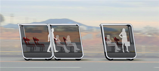 按照Next Future创始人、意大利工业设计师托马索(Tommaso Gecchelin)的设想,未来交通工具能够扬长避短,在汲取当前交通系统运作方式优点的同时,要精简其臃肿繁复的部分。他设计出一套能在公路上行驶的组合式自驾车舱。不过与目前常见交通工具不同的是,这种“豆荚车”不设固定行驶路线,而且用户只需使用手机APP预定行程即可。按照托马索的设想,单个车舱长度为2.7米,载客量为10人,车内设6个座位,还可容纳4人站立。