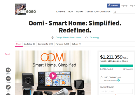 4月21日,FANTEM丰唐物联全新一代智能家居产品Oomi登陆indiegogo众筹,不到1小时即完成众筹5万美金计划目标,随后又在不到一个月的时间里,筹集金额突破100万美金。