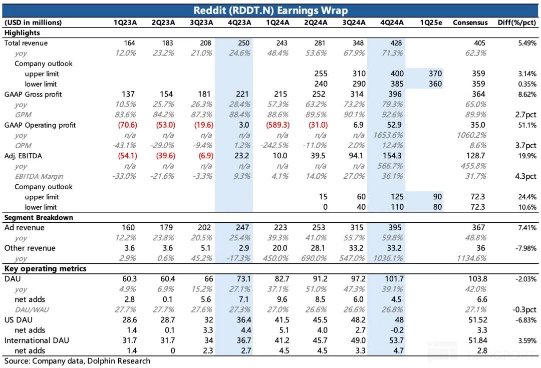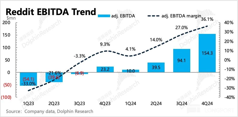 3. 盈利能力显著超预期:四季度 Reddit 经营效率亮眼,经调整 EBITDA 利润率达到 36%,环比大幅提高了 9pct,超出市场预期。其中商业化加快,使得毛利率优化了 2.5pct,剩下的 6.5pct 则来自不含股权激励 SBC 之外的费用端控制增长。