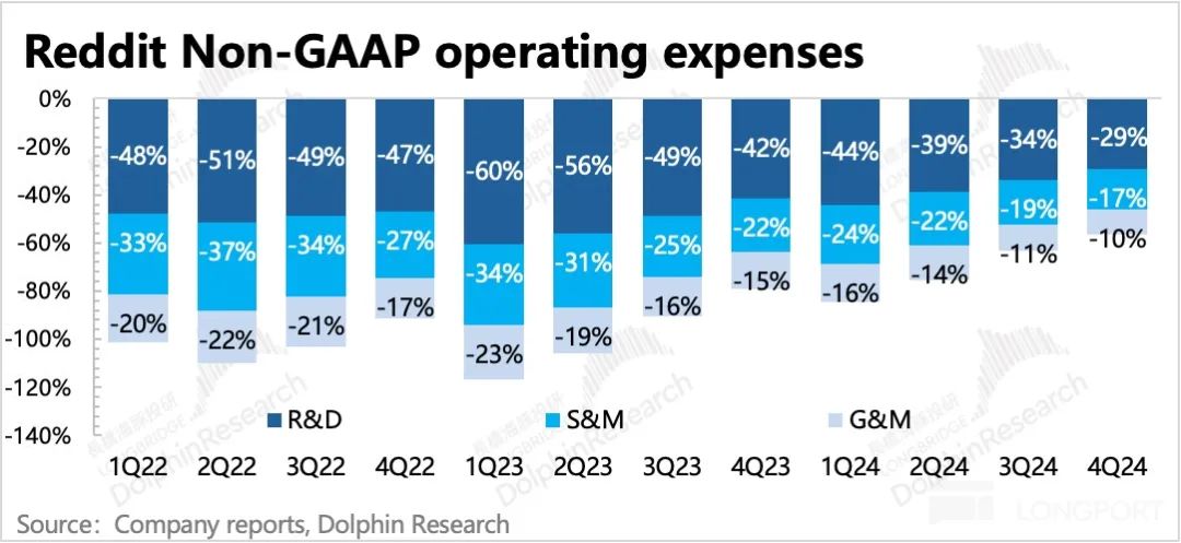 四季度 Reddit 经营效率亮眼,经调整 EBITDA 利润率达到 36%,环比大幅提高了 9pct,超出市场预期。其中商业化加快,使得毛利率优化了 2.5pct,剩下的 6.5pct 则来自不含股权激励 SBC 之外的费用端控制增长。