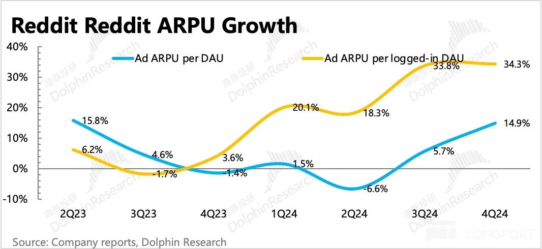 2. 广告变现加速:用户流量表现不佳,但却并未妨碍 Reddit 的商业化推进节奏。四季度在购物旺季的带动下,Reddit 实现广告收入 3.95 亿,同比继续加速增长,表现超出市场预期。这样一来,计算得单用户创造的广告价值同比加速增长近 15%。