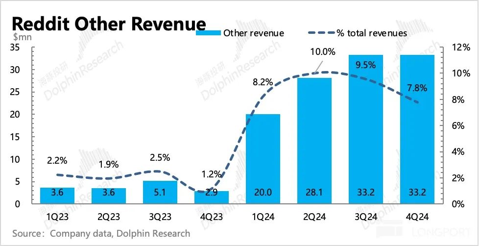 但管理层在电话会中提及,Reddit 在四季度与洲际交易所(在线期货交易平台)建立了合作关系,但可能订单规模不大,且刚刚开始签约授权,具体到业绩上贡献暂未体现。