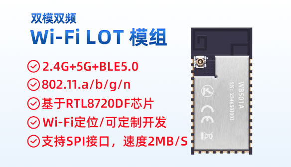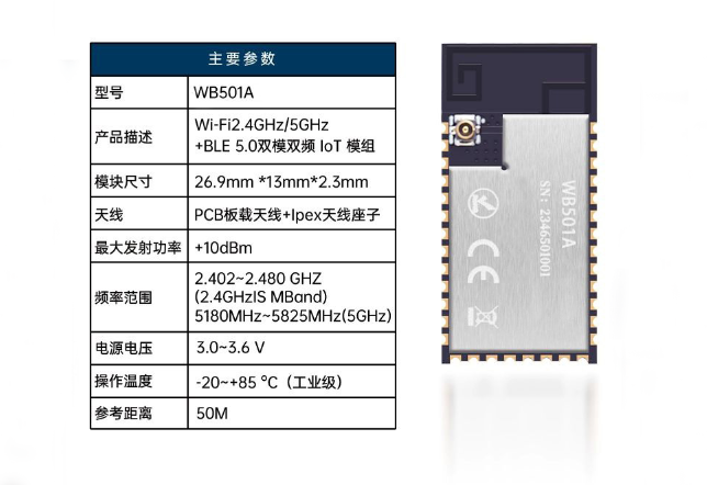 WB501A是一款集成了低功耗双频(2.4GHz和5GHz)无线局域网(WLAN)和蓝牙低能耗(v5.0)通信模组,支持串口或者SPI通信,SPI通信最快速度可达2MB/S,其特性如下:
