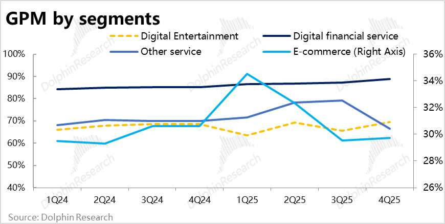 但公司整体的毛利率同比收窄了0.8pct,明显低于市场预期。分板块来看,游戏和金融板块的毛利率同环比都是在提升的。完全是因为电商板块自身毛利率下滑,同时收入占比又走高的影响。