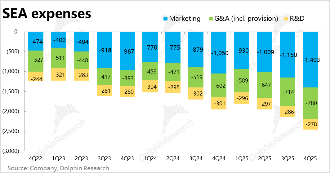 具体来看,费用超预期的主要来源是坏账损失计提,同增约80%, 此外,就是营销费用同比增长34%,绝对增速仍高,但实际和预期基本一致。