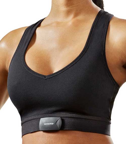 Sensoria的“智能跑步系统”包括两对智能袜、两个联网脚镯、一件健身压缩衣或嵌入心率电极的运动内衣、一个心率监测器。此外还有一个脚镯充电器,所有东西都可以连接到Sensoria的移动App和网页仪表板。
