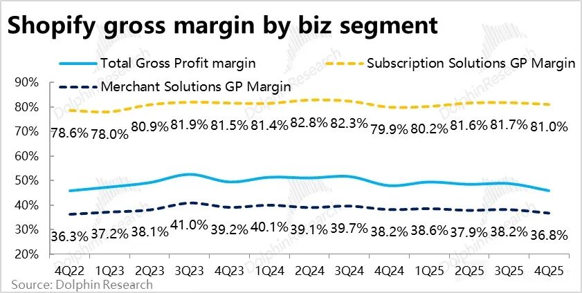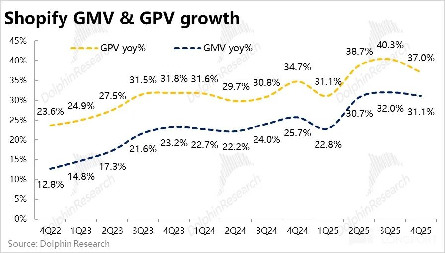 此外,Shopify 支付在 GMV 中的渗透率也进一步走高,环比提升了 1.8pct,带动支付额GPV 的增速达 37%,继续跑赢 GMV。