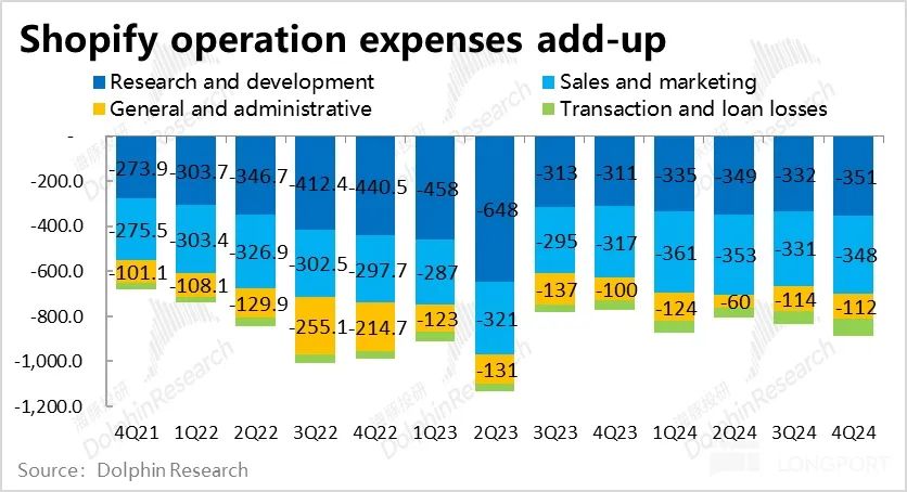 费用角度,本季Shopify 整体经营费用支出共约$8.9 亿,占收入比重约 32%,处于公司指引 32%~33% 的下限,同市场预期也大体相同。