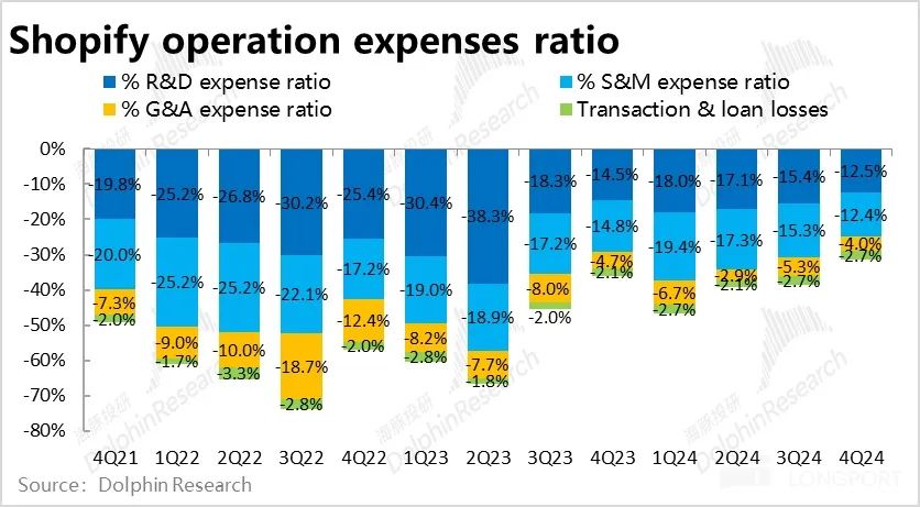 5、费用角度,本季Shopify 整体经营费用支出共约$8.9 亿,占收入比重约 32%,处于公司指引 32%~33% 的下限,同市场预期也大体相同。相比去年,费用占收入比重同比下降了约 4pct。