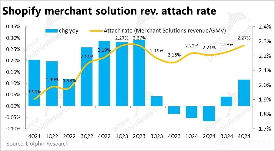3、营收层面,商家服务本季收入$21.5 亿,同比增速跳升到 31.2%,大幅跑赢市场预期的 27.4%。不过如上文提及的,除了强劲的 GMV 增长外,相当一部分是出自 PayPal 渠道收入确认口径变更的影响。对应着,本季商家服务的变现率(占 GMV 的比重)同比走高了 11bps。