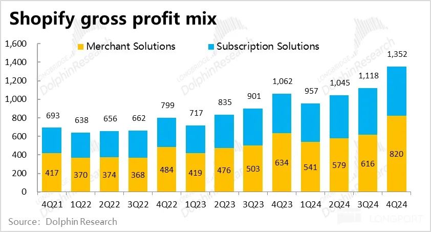 由于两项业务都有预期内或预期外的毛利率下滑,Shopify整体的毛利率也同比收缩了约 90bps,比市场预期也低约 50bps。导致总毛利润同比增长了 25% 到 13.5 亿,跑输营收 31% 的增速。